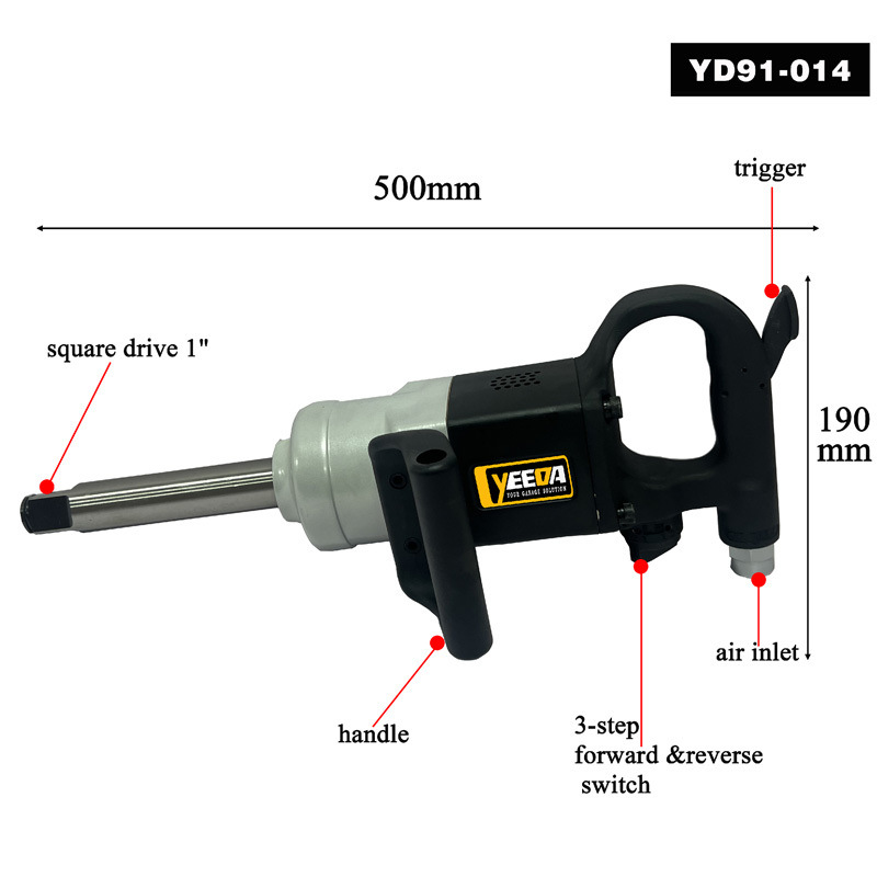 Αυτό το κλειδί κρούσης twin hammer βαρέως τύπου 1 ιντσών (YD91-014) διαθέτει μηχανισμό twin-hammer, προσφέροντας ισχυρή και σταθερή ροπή για εύκολο χειρισμό εργασιών συναρμολόγησης και αποσυναρμολόγησης μπουλονιών μεγάλου μεγέθους. Διαθέτει τετράγωνη υποδοχή 1", επιτρέποντας την εύκολη συμβατότητα με ένα ευρύ φάσμα καρυδάκια.